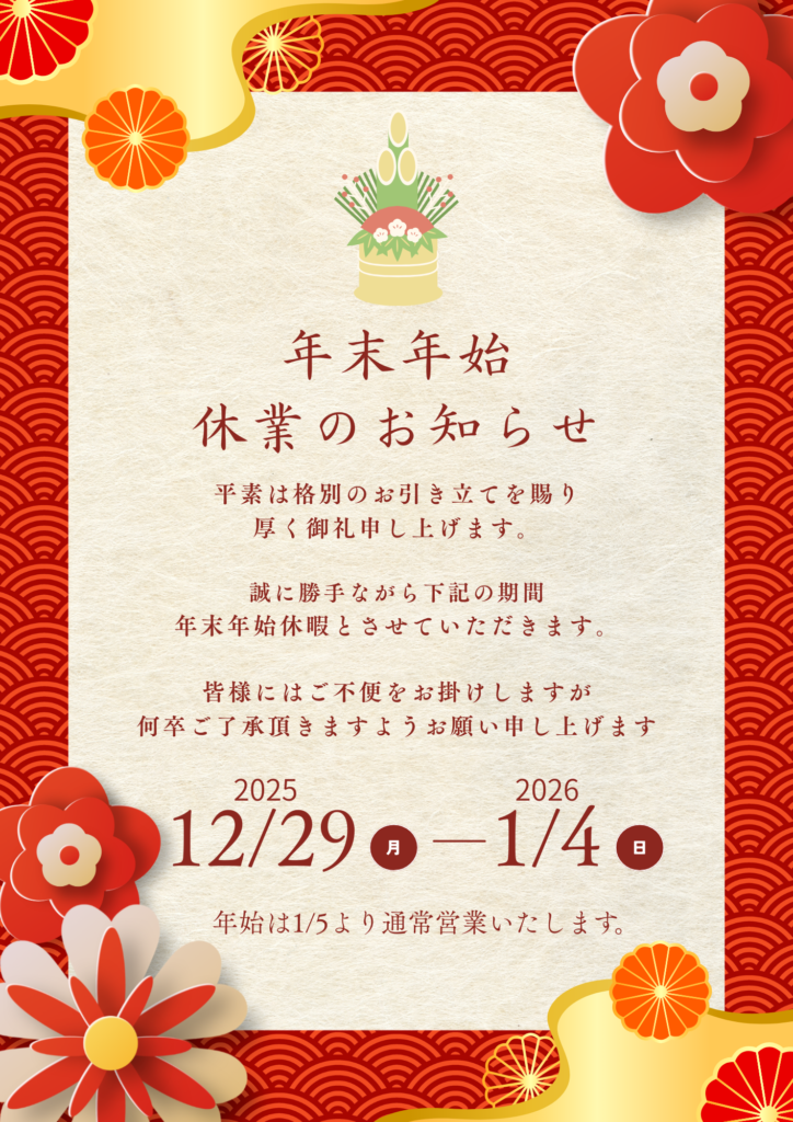 年末年始の定休日のお知らせです。