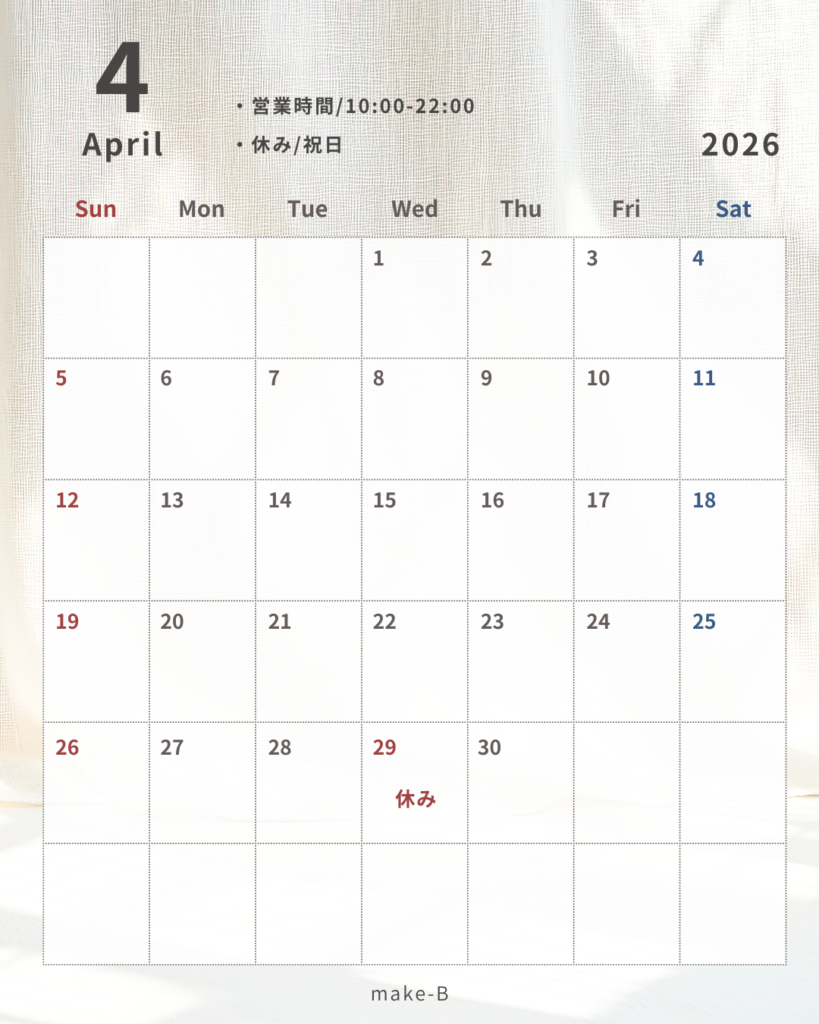 2026年2月25日 4月の定休日のお知らせ いつも当スクールのご利用ありがとうございます♪ 4月の定休日のお知らせです。 ご不便おかけしますが、何卒よろしくお願いいたします。 それでは本日もご来店、ご予約を心よりお待ちしております✨
