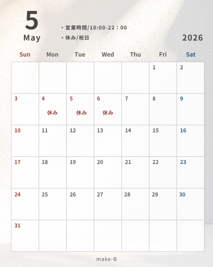 2026年3月25日 5月定休日のお知らせ いつも当スクールのご利用ありがとうございます♪ 5月の定休日のお知らせです。 ご不便おかけしますが、何卒よろしくお願いいたします。 それでは本日もご来店、ご予約を心よりお待ちしております